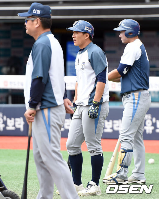 6일 오후 경기 수원 케이티위즈파크에서 열릴 '2015 타이어뱅크 KBO 리그 kt 위즈와 NC 다이노스의 경기에 앞서 NC 이종욱이 타격 훈련을 하는 동료들을 바라보고 있다.