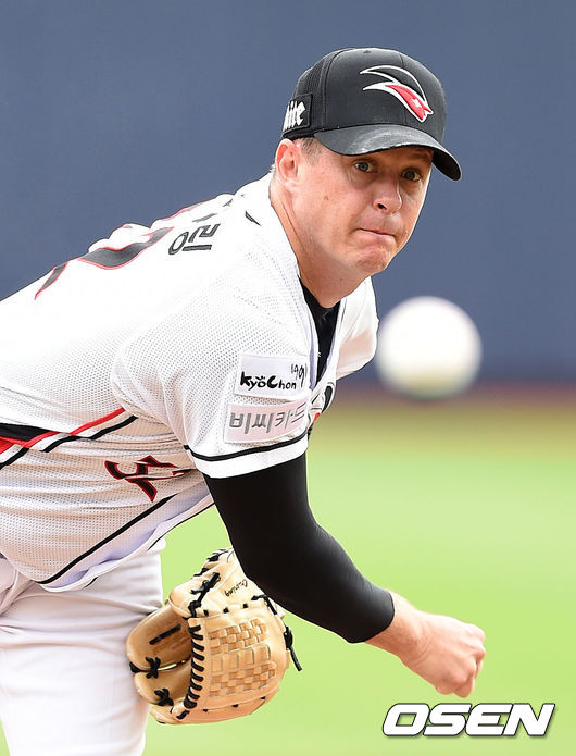 1회초 무사에서 kt 선발 투수 옥스프링이 힘차게 공을 던지고 있다.