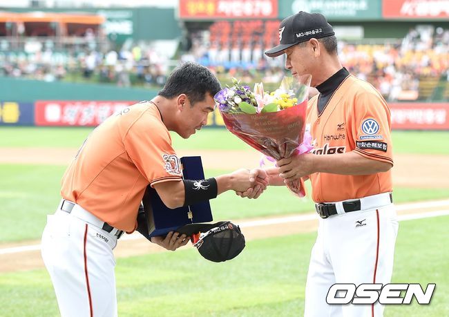 경기 시작을 앞두고 KBO리그 최초 10년 연속 20도루 기록을 달성한 정근우가 시상식을 마치고 김성근 감독에게 축하 꽃다발을 받고 있다.