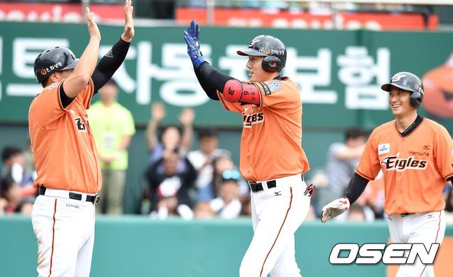 2회말 한화 공격 1사 1, 2루 상황 김회성이 선제 중월 스리런포를 날리고 홈을 밟은 뒤 김태균-정현석과 인사를 나누고 있다.