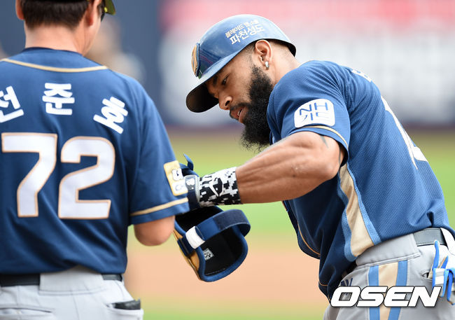 3회초 1사 만루에서 NC 테임즈가 우전 적시타를 치고 전준호 코치와 하이파이브를 하고 있다.