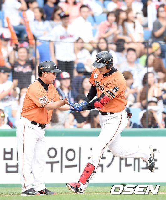 7회말 한화 공격 선두타자로 나선 김회성이 우중간 솔로포를 날리고 그라운드를 돌며 김광수 코치와 인사를 나누고 있다.