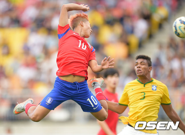 전반 한국 이승우가 브라질 수비진과 공중볼 다툼을 하고 있다.