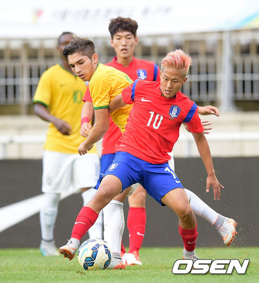 전반 한국 이승우가 브라질 선수와 볼다툼을 하고 있다.