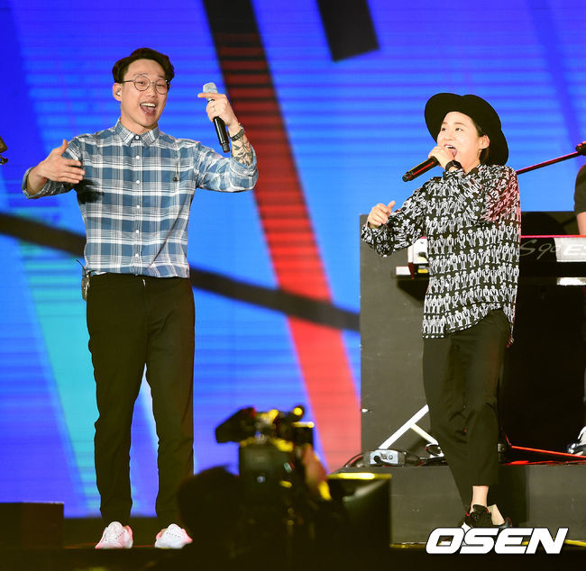 6일 오후 서울 마포구 상암MBC 앞 상암문화광장에서 열린 MBC 라디오 DJ 콘서트에서 십센치, 김신영이 화려한 콜라보 무대를 펼치고 있다.