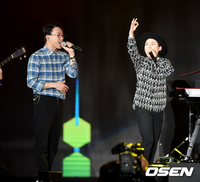 6일 오후 서울 마포구 상암MBC 앞 상암문화광장에서 열린 MBC 라디오 DJ 콘서트에서 십센치, 김신영이 화려한 콜라보 무대를 펼치고 있다.