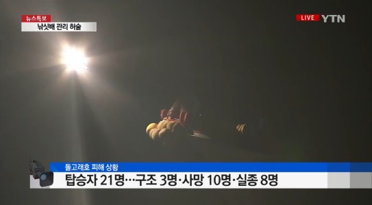 7일 해양 경찰에 따르면 현재까지 돌고래호 탑승자는 잠정적으로 21명인 것으로 집계됐다. 이 가운데 3명이 구조됐지만, 10명이 숨진 채 발견됐고 나머지 8명은 여전히 실종상태다.