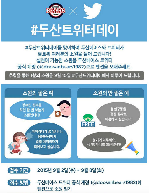 두산 베어스가 ‘트위터 코리아’와 함께 10일 잠실 야구장에서 열리는 KIA와의 홈경기에 ‘#두산트위터데이' 이벤트를 개최한다.