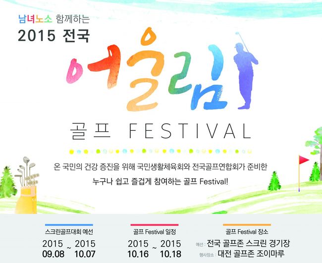 ㈜골프존(대표 장성원)은 국민생활체육 전국골프연합회(회장 편흥삼)가 주최 및 주관하고 문화체육관광부, 국민생활체육회, 국민체육공단, 골프존이 후원하는 '2015 전국 어울림 골프 페스티벌'이 10월 16일부터 18일까지 사흘 동안 대전 골프존 조이마루에서 진행된다고 밝혔다.