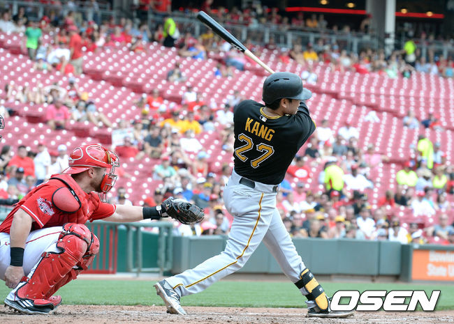 강정호는 세 번째 타석에서 안타를 날렸다. 0-3으로 리드 당하던 6회 2사 후 타석에 들어선 강정호는 신시내티 선발 앤소니 디스클라파니의 4구째(볼카운트 2-1)슬라이더(88마일)을 밀어 쳤다. 원바운드로 외야 펜스 하단에 맞는 타구였으나 신시내티 우익수 제이 브루스가 맨손으로 튀어나오는 볼을 캐치해 2루까지는 진출하지 못했다(다음 타자 페드로 알바레스 삼진).