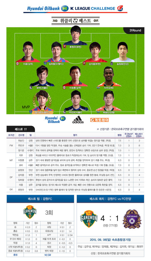 공격진엔 정기운과 함께 2골을 기록한 최승인(강원)과 1골 1도움을 올린 주민규(서울이랜드)가 이름을 올렸다.