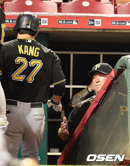 8회초 무사 피츠버그 허들 감독이 솔로 홈런을 때린 강정호와 하이파이브를 하고 있다.