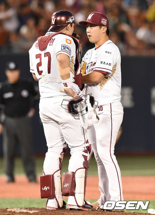 9일 오후 서울 목동구장에서 열린 '2015 타이어뱅크 KBO 리그' 넥센 히어로즈와 두산 베어스의 경기 2회초 1사 1루 문성현이 박동원과 마운드에서 이야기를 나누고 있다.