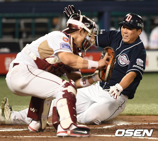 9일 오후 서울 목동구장에서 열린 '2015 타이어뱅크 KBO 리그' 넥센 히어로즈와 두산 베어스의 경기 3회초 1사 1,2루 최주환의 1타점 적시타에 2루주자 김현수가 득점하고 있다.