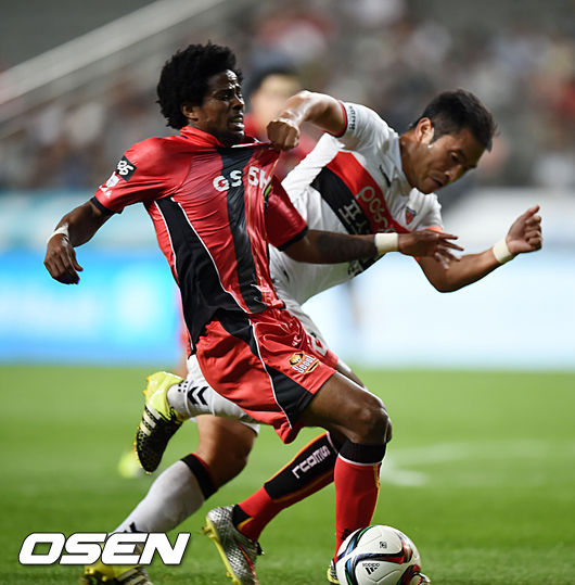 9일 오후 서울월드컵경기장에서 열린 '2015 현대오일뱅크 K리그 클래식' FC 서울과 포항 스틸러스 경기, 서울 아드리아노가 포항 문전에서 슛을 시도하던 중 포항 황지수에게 몸싸움에 밀려 넘어지고 있다.