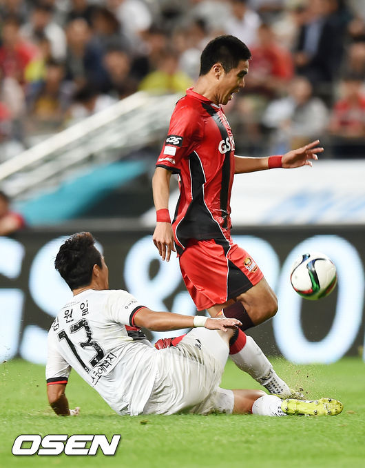 9일 오후 서울월드컵경기장에서 열린 '2015 현대오일뱅크 K리그 클래식' FC 서울과 포항 스틸러스 경기, 전반 서울 박희성이 쇄도 도중 포항 김원일에게 태클을 당하고 있다.
