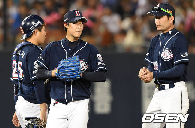 9일 오후 서울 목동구장에서 열린 '2015 타이어뱅크 KBO 리그' 넥센 히어로즈와 두산 베어스의 경기 4회말 2사 2,3루 허준혁이 마운드를 내려가고 있다. 진야곱으로 교체.