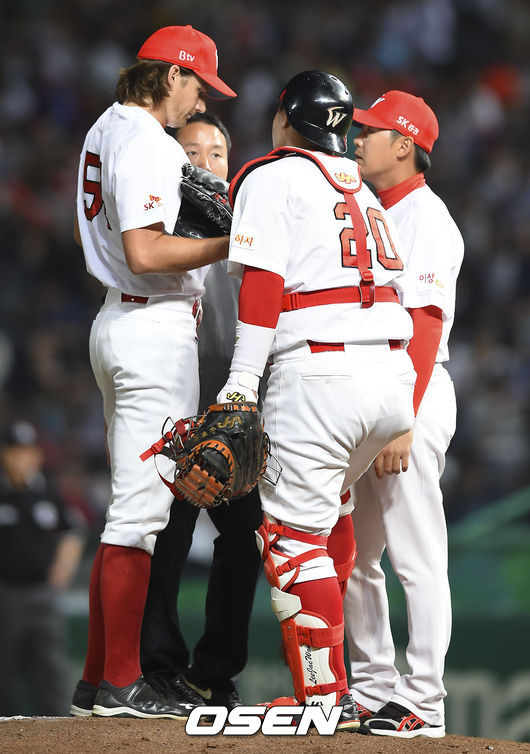 9일 인천SK행복드림구장에서 열린 ‘2015 타이어뱅크 KBO리그’ SK 와이번스와 롯데 자이언츠의 경기,6회말 2사 만루서 SK 선발투수 세든이 김원형 투수코치와 마운드서 이야기를 나누고 있다.