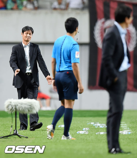 9일 오후 서울월드컵경기장에서 열린 '2015 현대오일뱅크 K리그 클래식' FC 서울과 포항 스틸러스 경기, 후반 최용수 감독이 심판에게 어필을 하고 있다.