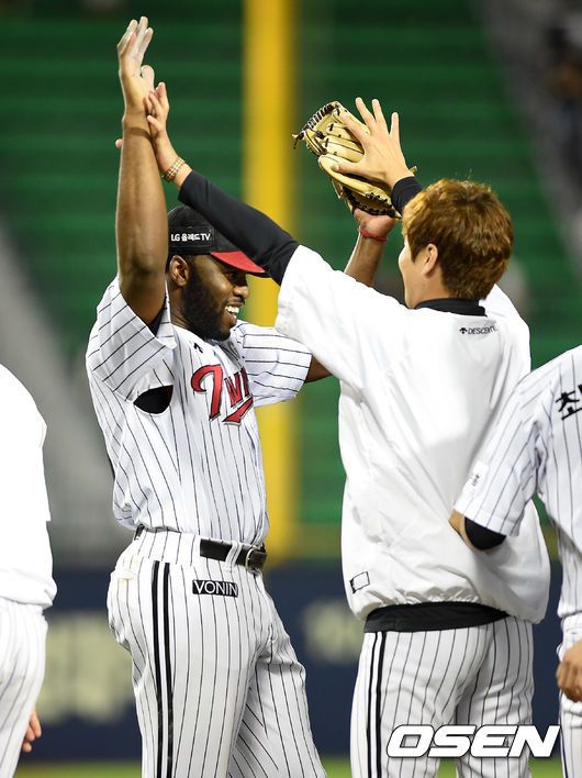 경기후 LG 소사가 우규민과 승리를 기뻐하고 있다./ jpnews@osen.co.kr