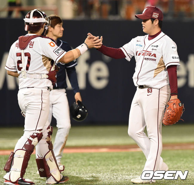 9일 오후 서울 목동구장에서 열린 '2015 타이어뱅크 KBO 리그' 넥센 히어로즈와 두산 베어스의 경기 종료 후 박동원과 한현희가 하이파이브를 하고 있다.