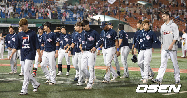 9일 오후 서울 목동구장에서 열린 '2015 타이어뱅크 KBO 리그' 넥센 히어로즈와 두산 베어스의 경기 종료 후 두산 선수들이 관중들에게 인사를 하고 걸어나가고 있다.