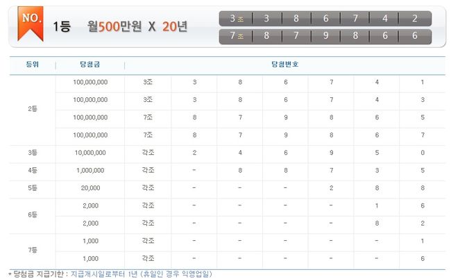 발표 결과, 1등 당첨번호는 3조 386742번과 7조 879866번으로결정됐으며 1등 당첨금은 매달 500만 원씩 20년간 연금 형식으로 지급된다. 세금을 뗀 실수령액은 390만 원 정도다.