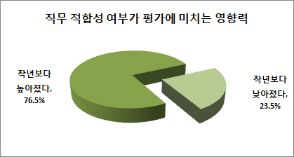 온라인 취업포털 사람인이 기업 260개사를 대상으로 ‘직무 적합성 여부가 평가에 미치는 영향력’을 주제로 조사한 결과, 76.5%가 ‘작년보다 높아졌다’라고 답했다.