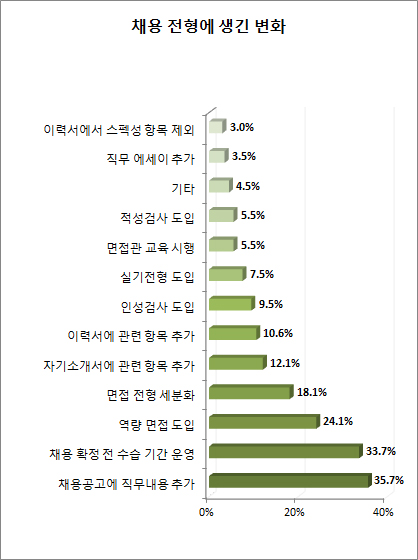 직무 적합성이 중요해지면서 채용 전형에 생긴 변화로는 ‘채용공고에 직무내용 추가’(35.7%, 복수응답)을 첫 번째로 꼽았다. 뒤이어 ‘채용 확정 전 수습 기간 운영’(33.7%), ‘역량 면접 도입’(24.1%), ‘면접전형 세분화’(18.1%), ‘자기소개서에 관련 항목 추가’(12.1%), ‘이력서에 관련 항목 추가’(10.6%) 등의 순이었다.