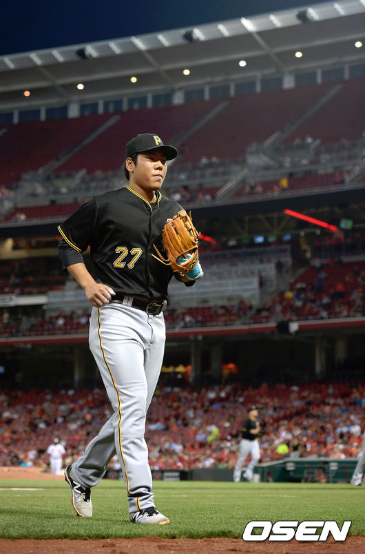 4회말 수비를 마친 피츠버그 강정호가 더그아웃을 들어오고 있다.