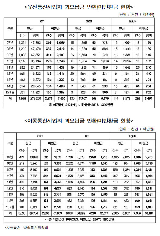 2007년부터 집계한 과오납금 발생건은 유선통신3사(KT/SKB/LGU+)의 경우 약 1,136만여건으로 그 중 약 312만건(약 269억원)이 미환급 되었고 이동통신3사(SKT/KT/LGU+)의 경우 총 3200만건에 이르는 과오납금 중 약 1616만건(약 825억원)이 미환급되어, 유무선 통신사가 돌려줘야할 과오납 금액이 총 1094억원에 달한다.