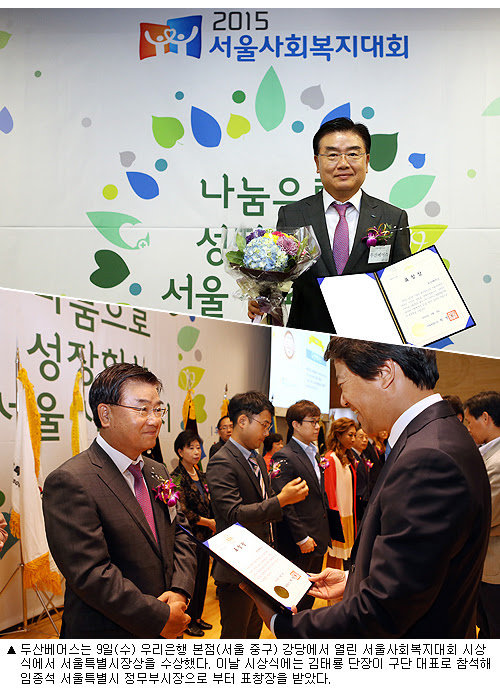 두산 베어스가 9일 우리은행 본점 대강당에서 열린 ‘2015 서울사회복지대회’에서 서울특별시장상을 수상했다.