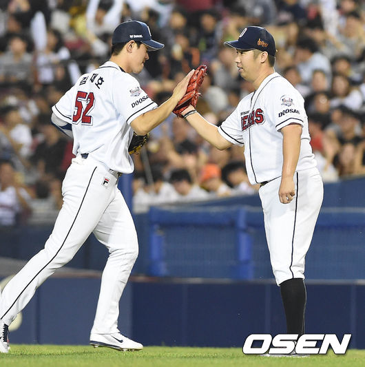 10일 오후 서울 잠실구장에서 열린 '2015 타이어뱅크 KBO 리그' 두산 베어스와 KIA 타이거즈의 경기 4회초 1사 1,2루 나지완을 병살로 처리한 유희관이 덕아웃으로 향하며 김재호와 하이파이브를 하고 있다.