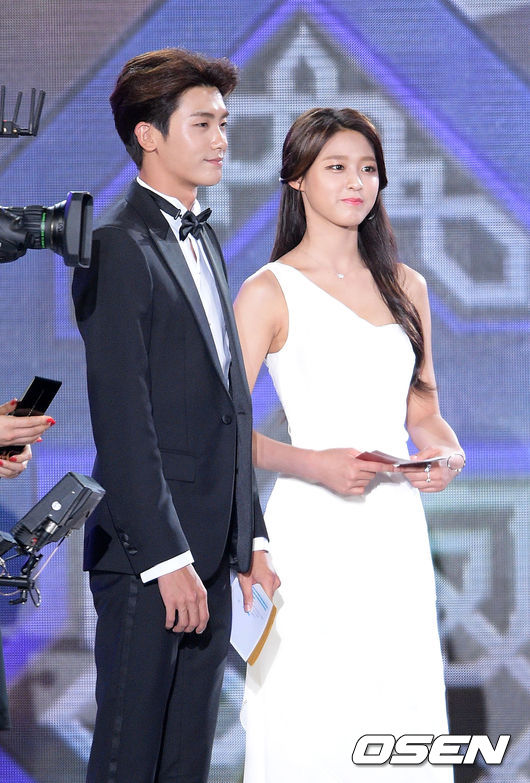 박형식과 설현이 한류 드라마 주제가상을 시상하기 위해 입장하고 있다.