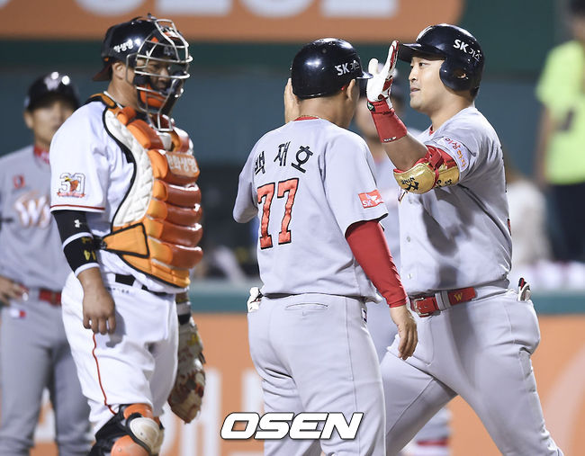 SK 타선도 한화 선발 미치 탈보트에 막혀 고전했지만 선취점을 내며 주도궈을 잡았다. 2회초 선두 이재원이 중앙 펜스를 맞히는 2루타로 포문을 연 뒤 박재상이 좌중간 빠지는 1타점 2루타를 터뜨리며 가볍게 선취점을 냈다. 계속된 1사 1·3루에서 후속타 불발로 추가점에 실패했지만 탈보트가 내려간 7회 불펜 공략에 성공했다.