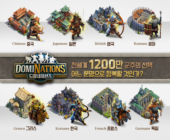 ‘도미네이션즈’는 한국, 로마, 독일 등 개성이 뚜렷한 여덟 개의 국가들이 가진 특수성을 게임 내 세밀하게 녹여내고, ‘석기시대’부터 단계별로 실존 문명을 발전시켜 나가는 차별화된 게임성으로 호평을 얻고 있다.