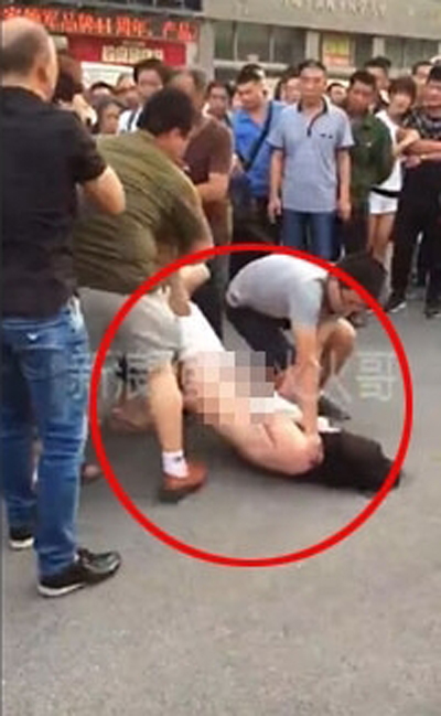 동영상을 보면 남성 한명이 길바닥에 쓰러져 있는 여성을 붙잡고 있고 다른 중년 여성이 젊은 여성의 바지를 벗기려고 달려든다. 이 젊은 여성의 상의는 이미 벗겨져있는 상태.