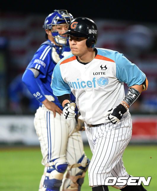 8회말 무사에서 롯데 강민호가 솔로포를 날리고 홈을 밟고 있다.