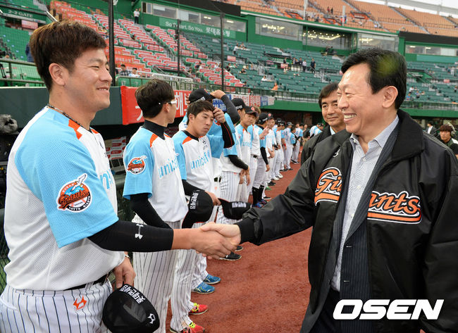 경기에 앞서 롯데그룹 신동빈 회장이 야구장을 방문, 강민호와 인사를 나누며 선수단을 격려하고 있다.