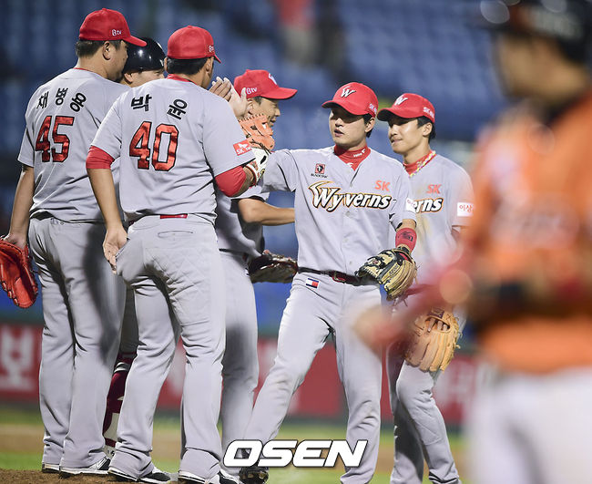 경기종료 후 SK 선수들이 승리의 기쁨을 나누고 있다. /soul1014@osen.co.kr