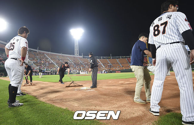12일 오후 부산 사직구장서 열린 '2015 타이어뱅크 KBO 리그' 롯데 자이언츠와 한화 이글스의 경기, 3회말 경기재개를 위해 그라운드가 정비가 진행되고 있다.