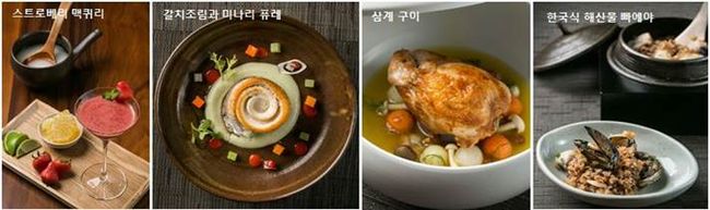 '빵(Bbang) 5종'은 쉬는 시간이 없는 라운지의 특성상 아무때고 간편하게 즐길 수 있도록 내놓은 것이다. 가격은 세금포함 2만 4000원부터~(봉사료 없음) 보쌈과 삼계탕을 현대적 감각으로 재해석한 '보쌈'과 '삼계 구이' 단품 가격은 세금포함 2만 9000원부터~(봉사료 없음) 해외에서 직접 공수한 1kg 이상의 '왕새우' 요리와 5코스로 구성된 '만찬 세트' 역시 새롭다. 5코스 만찬 세트 가격은 1인 기준 세금포함 9만원(봉사료 없음)이다.