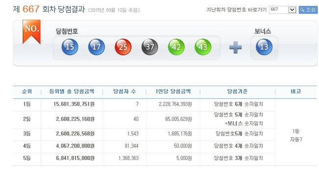 667회 로또당첨번호./ 나눔로또 홈페이지 캡처.