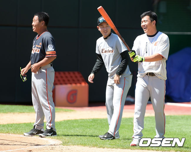 13일 오후 부산 사직야구장에서 열릴 '2015 타이어뱅크 KBO리그' 롯데 자이언츠와 한화 이글스의 경기에 앞서 한화 정근우가 쇼다 코치와 이야기를 나누며 미소를 짓고 있다.