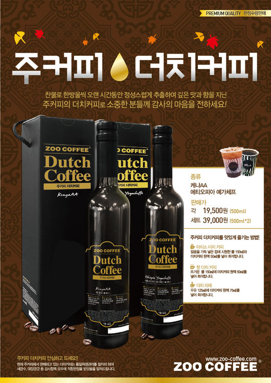 패밀리형 카페 프랜차이즈 커피전문점 주커피(ZOO COFFEE)는 2015년 추석을 맞아 오랜 시간 한방울 한방울 정성으로 추출한 '주커피 더치커피 선물세트'를 출시했다고 7일 밝혔다.