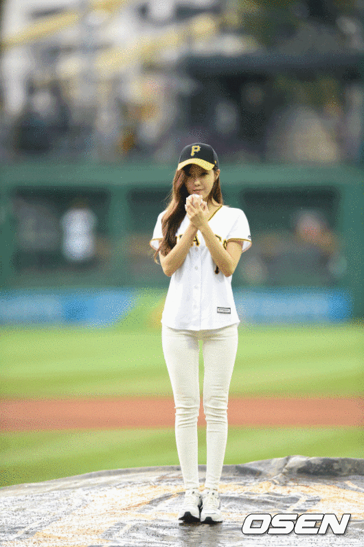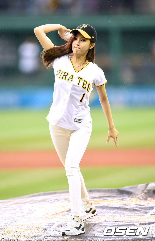 경기에 앞서 티아라 효민이 시구를 하고 있다.