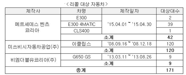 리콜대상은 2015년 4월 1일부터 2015년 4월 30일까지 제작된 E300 2대, E300 4MATIC 39대, CLS400 1대이며 해당 자동차 소유자는 2015년 9월 14일부터 메르세데스-벤츠코리아(주) 서비스센터에서 무상으로 고무실링 점검 및 교환을 받을 수 있다.