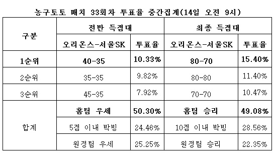 국민체육진흥공단(www.kspo.or.kr)이 발행하는 체육진흥투표권 스포츠토토(www.sportstoto.co.kr)는 15일 오후 7시에 고양체육관에서 열리는 오리온스-서울SK전을 대상으로 한 농구토토 매치 33회차 투표율을 중간 집계한 결과 49.08%가 홈팀 오리온스의 승리를 예상했다고 전했다.