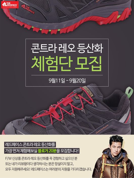 한편 레드페이스는 등산화 출시에 맞추어 소비자가 선(先) 경험을 할 수 있도록 등산화 체험단을 모집한다. 블로거라면 누구나 레드페이스 공식 블로그(http://blog.naver.com/rf58)를 통해 응모할 수 있으며 오는 20일까지 응모 가능하다. 체험단으로 선정된 사람은 '콘트라 레오 등산화'를 착용하고 아웃도어 활동과 기능 테스트 등의 활동을 자유롭게 진행할 수 있으며, 활동 체험수기를 2회 작성하게 된다. 당첨자 발표는 오는 22일 레드페이스 공식 블로그에서 확인할 수 있다. /letmeout@osen.co.kr
