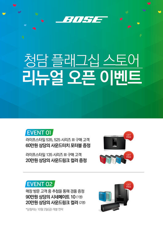 이번 리뉴얼 오픈을 기념하여 오는 25일까지 방문 및 구매자 대상으로 특별한 이벤트도 진행한다. 라이프스타일 535, 525 시리즈 III 홈시어터 구매자 대상으로 60만원 상당의 와이파이 스피커 '사운드터치 포터블'을 증정하며, 라이프스타일 135 시리즈 III 구매자 대상으로는 20만원 상당의 사운드링크 컬러 블루투스 스피커를 증정한다.